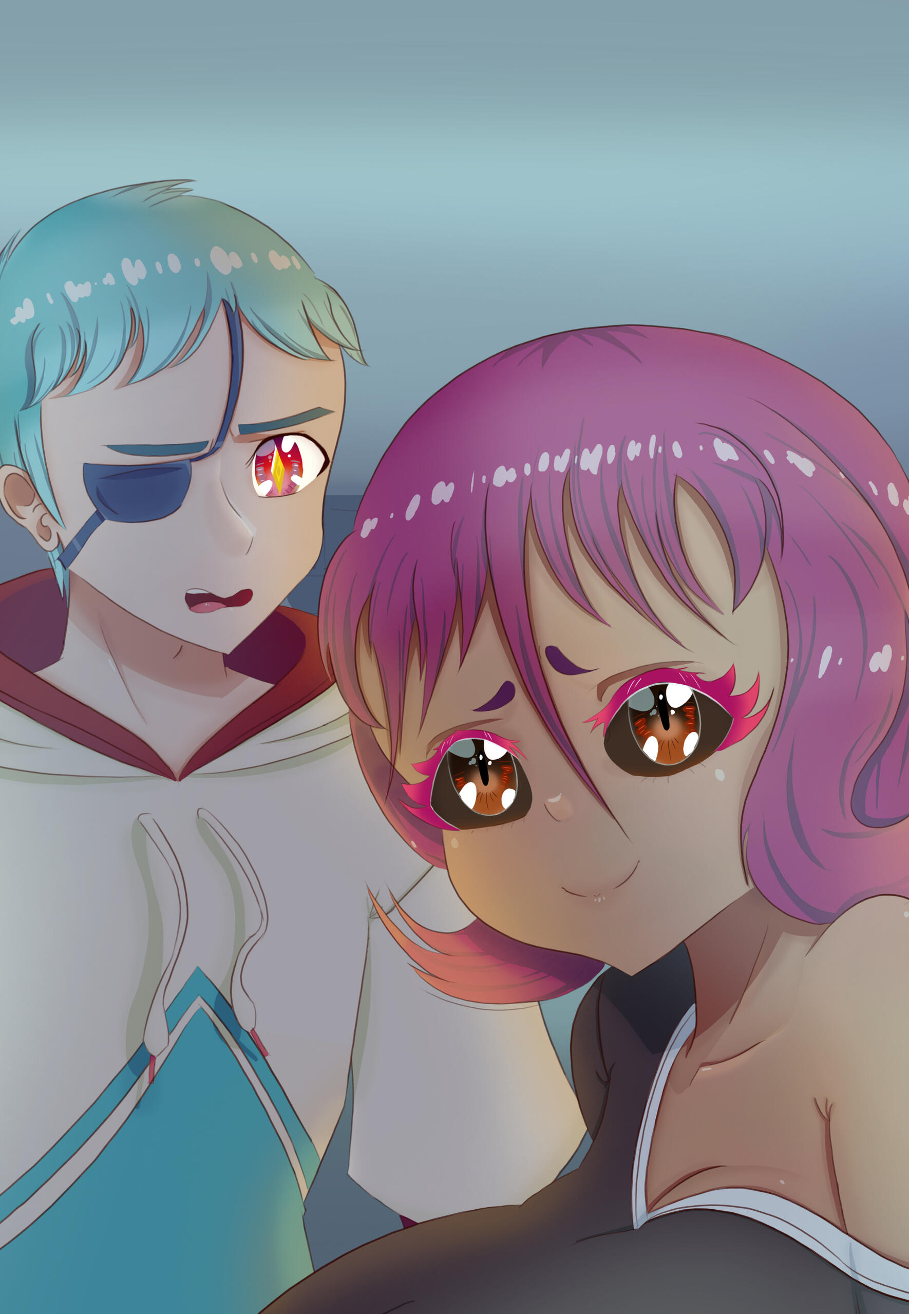 The boy wore a white cloak that wrapped around his entire torso. Cyan hair peeked from his hood, and his one red eye glimmered a diamond-gold pupil. A blue eyepatch wrapped around his right eye. Holes and rips in his tattered attire allowed visible his pale white skin.